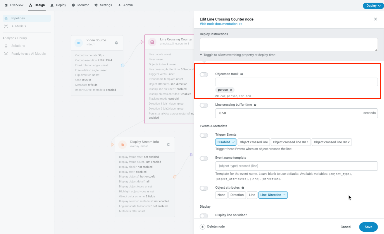 - Connect the output of the Video Source node to the Track Objects node if there are no other AI models, and that to any of the other analytics nodes.