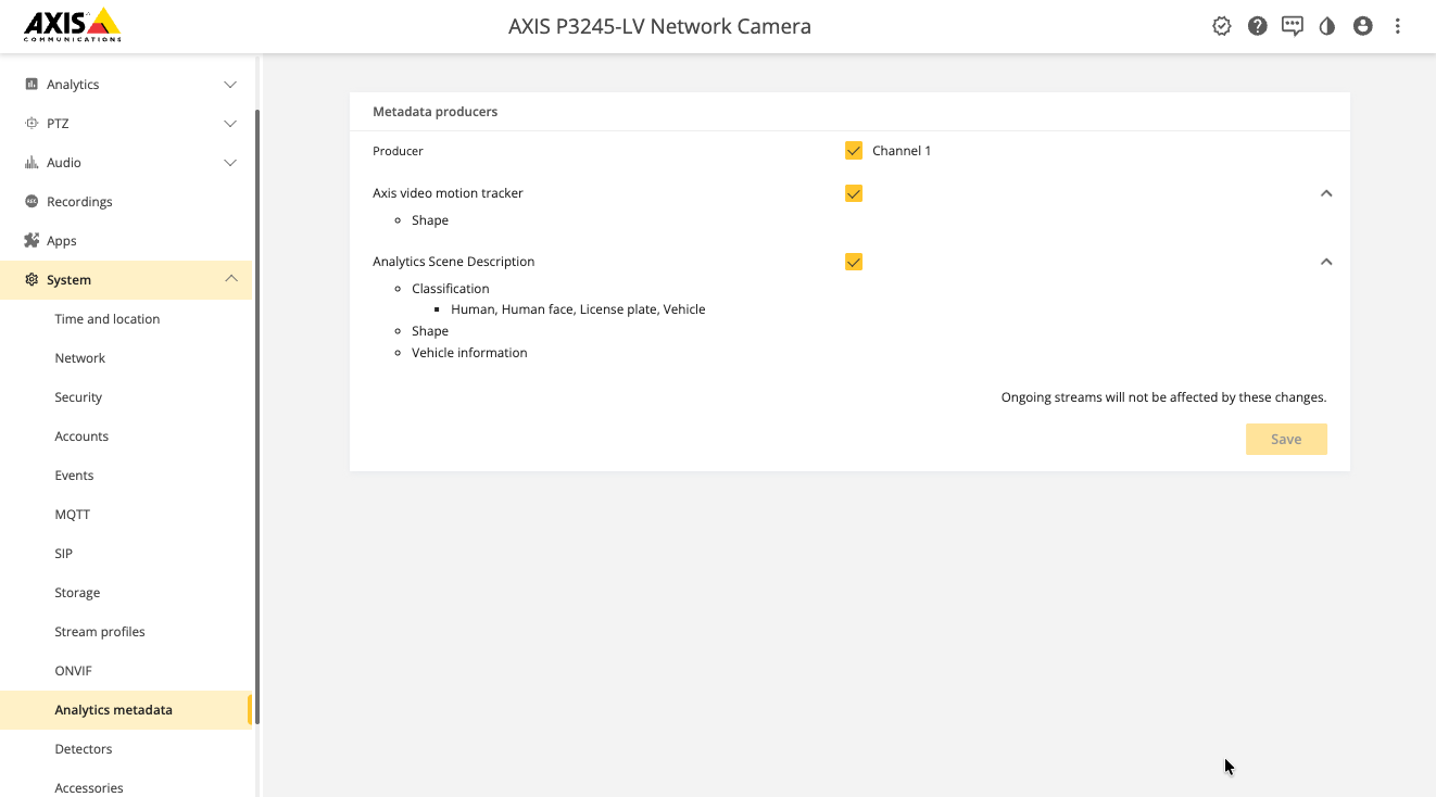 - On some camera models, enable analytics metadata stream for the ONVIF profile