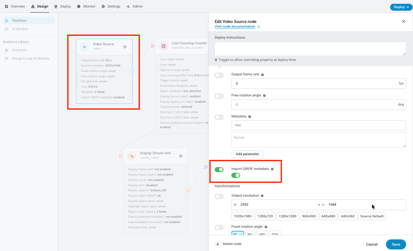 - In the pipeline's Video Source node, enable "Import ONVIF metadata" option