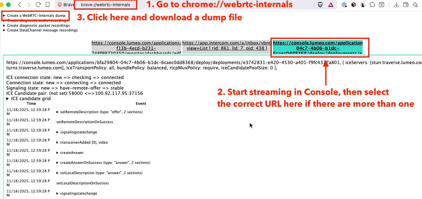 Create a WebRTC-internals dump - Download the dump file and email that to Lumeo support.