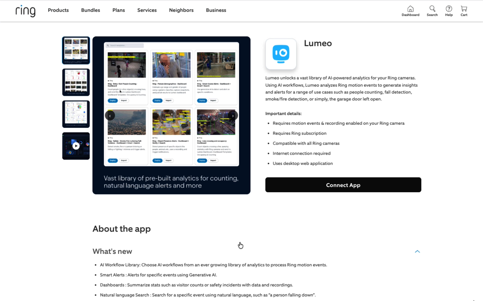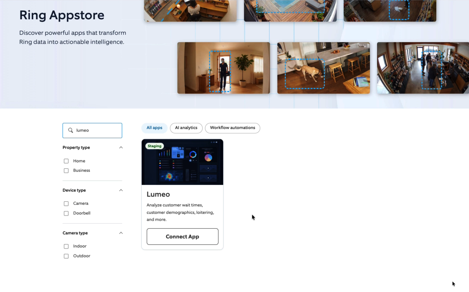 - Select Lumeo in the Ring Appstore or mobile app (available to invite-only users), and enable it for your Ring account