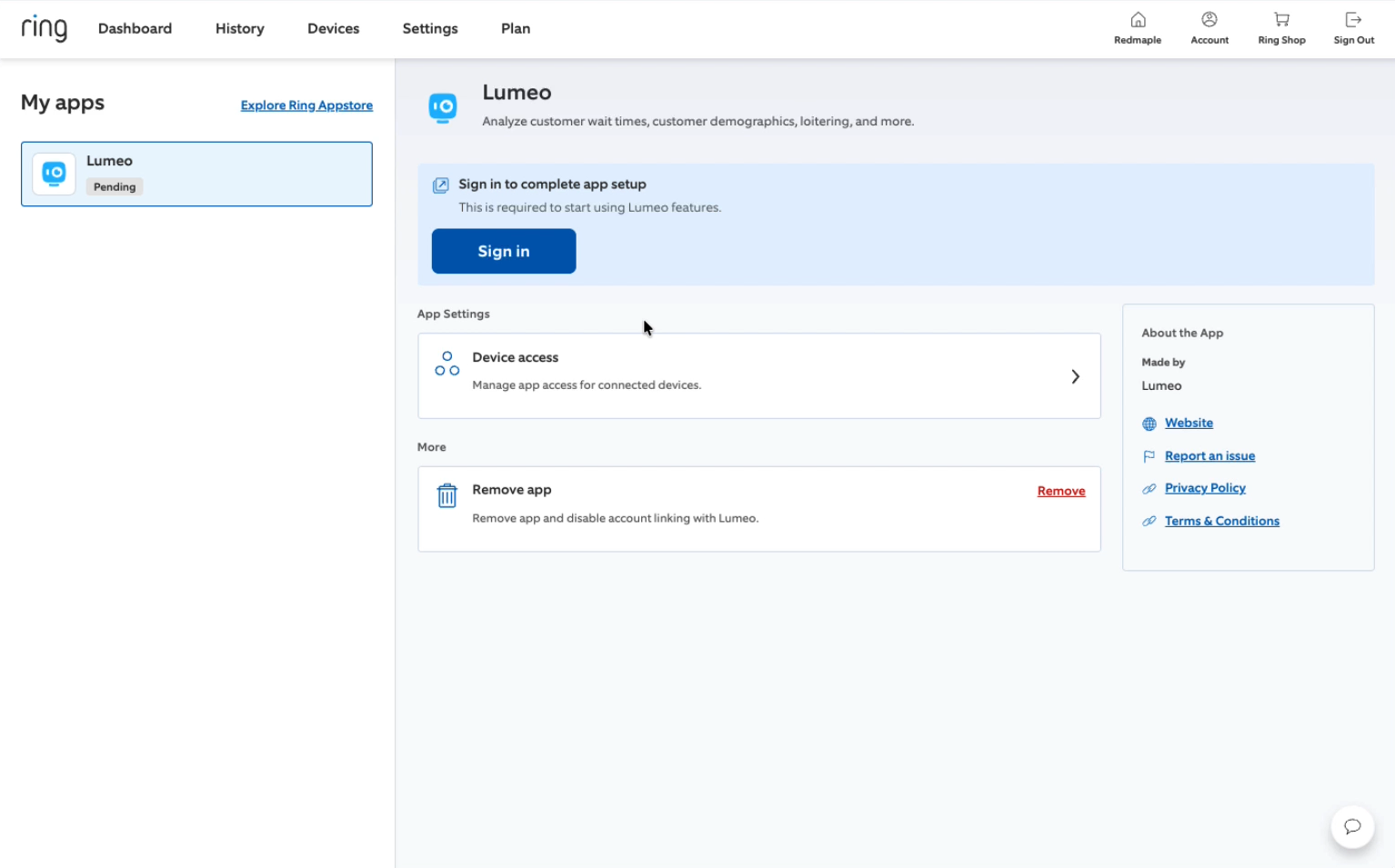 - Click Sign in button in the Lumeo app in your Ring account to link to your Lumeo account