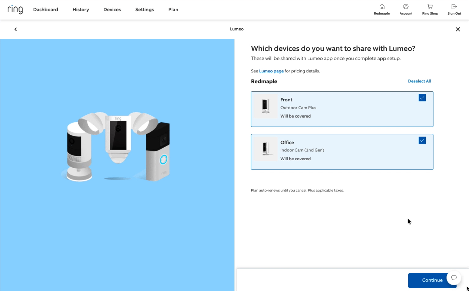 - Sign back into your Ring account and choose Allow data sharing with Lumeo