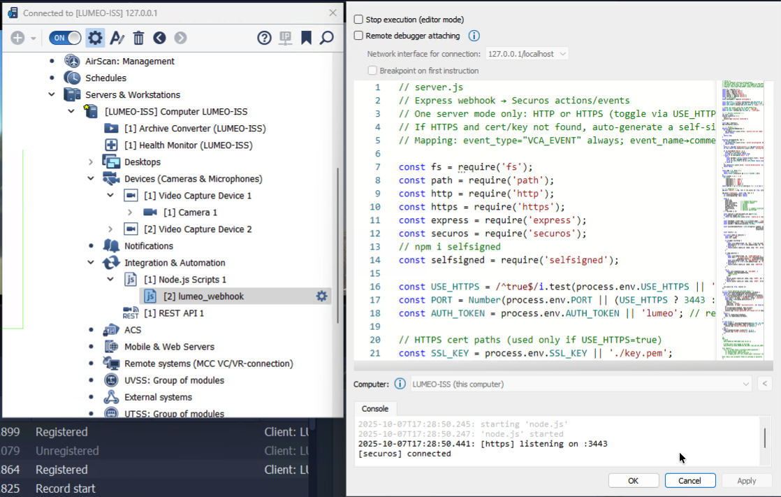 Copy the following script into a new nodejs script within SecureOS configuration under Integration & Automation section. Remember to change the default auth token to some random value and provide that to this node's configuration in Lumeo in the password field.